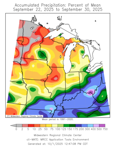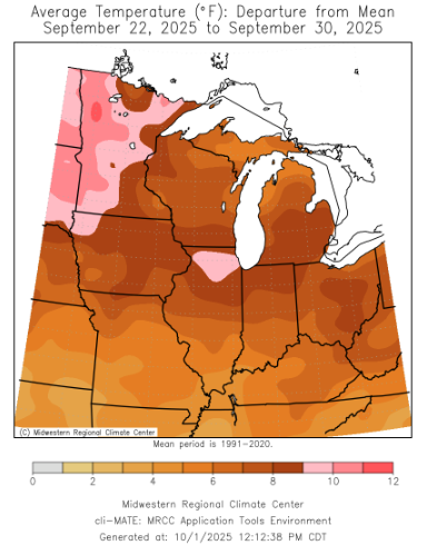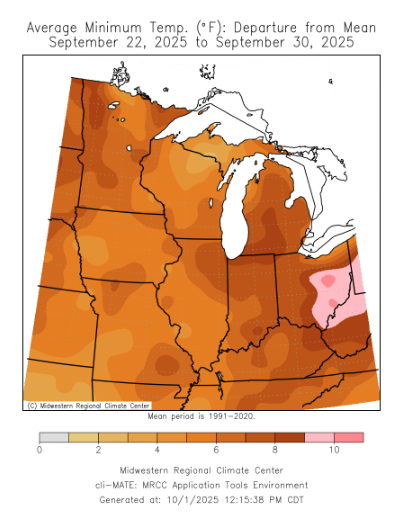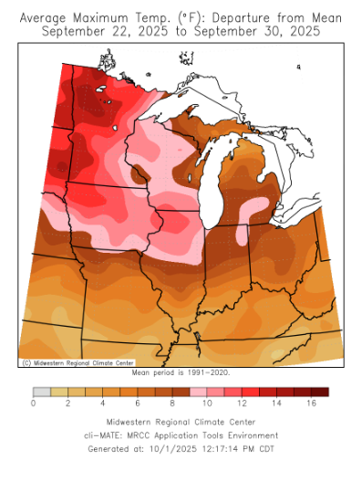 Maximum temperatures were anomalously warm. Across the northwest, maximum temperatures were 10-15°F above normal for the week (Figure 3). To the east, across Michigan and the Ohio Valley, maximum temperatures were 6-10°F above normal for the week. Across the southern areas, maximum temperatures were less anomalous at 3-6°F above normal. Over 200 daily high temperature records were set across the region this week (Figure 4). In Duluth, Minnesota, the temperature rose to 81°F on September 29, which was only the 4th time since the year 2000 that a temperature that high was observed on or after September 29.