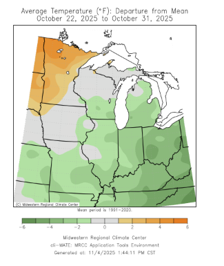 Maximum temperatures were below normal for much of the region from I-80 southward (Figure 3). Across the southernmost areas, maximum temperatures were 6-7°F below normal. Across northern Minnesota, Michigan’s Upper Peninsula (UP), and northern Wisconsin, maximum temperatures were 2-4°F above normal.