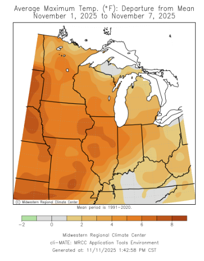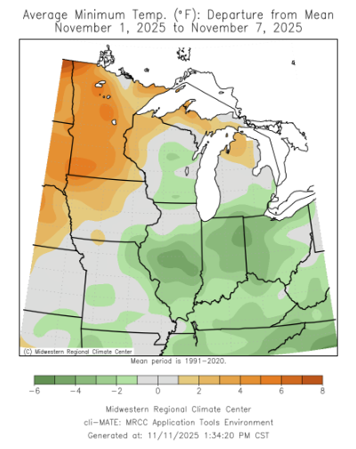 Average minimum temperatures were slightly below normal by 2-4°F across southern and eastern parts of the region (Figure 2). Meanwhile, across Minnesota, northwestern Wisconsin, and northern Michigan, minimum temperatures were slightly above normal by 2-4°F.
