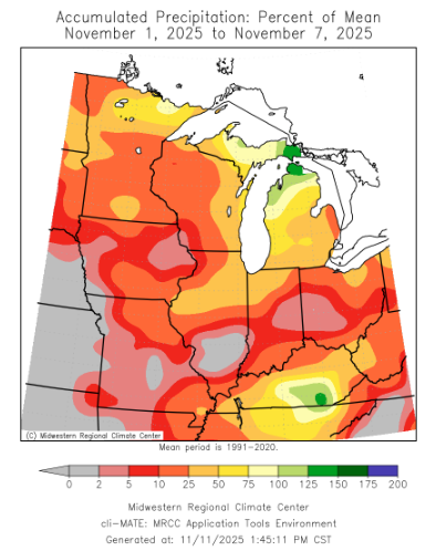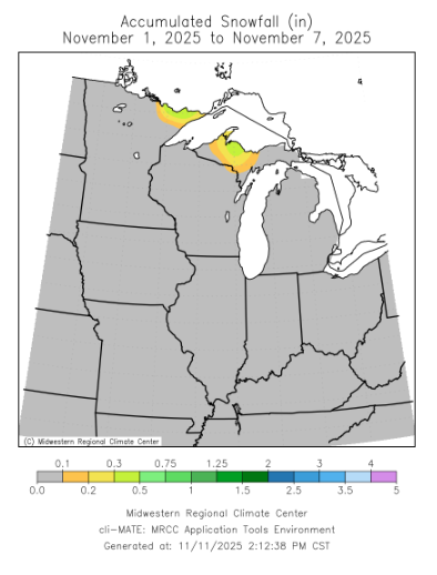 Precipitation was lacking, with most of the region picking up little to no precipitation (Figure 4). Precipitation was less than 25 percent of the 1991-2020 normal for most of the region. Precipitation was near or slightly above normal for northern Michigan. There was minor snowfall of under 1 inch across Minnesota’s Arrowhead region and Michigan’s Upper Peninsula (Figure 5).