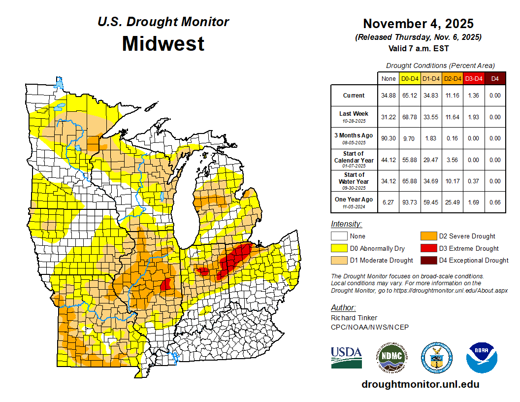Drought has persisted across the region, although there have been slight improvements in certain categories. D0 (abnormally dry) declined by 3 percent, mainly across the south (Figure 6). Improvements were made across Wisconsin where much of D1 (moderate drought) was removed. However, D1 was expanded across portions of northern Ohio and southern Illinois. D3 (extreme drought) was removed from Missouri.