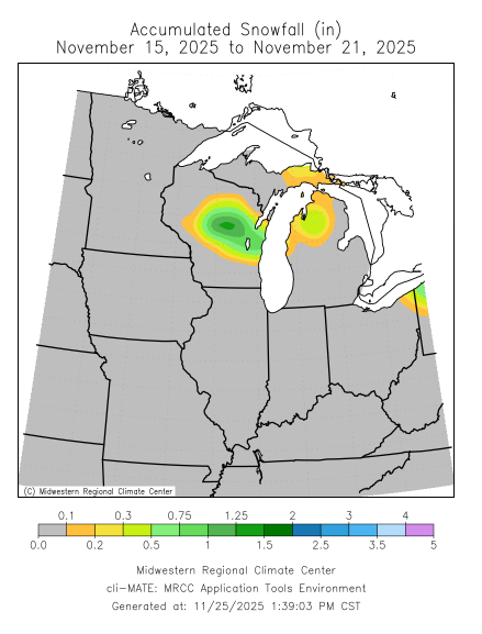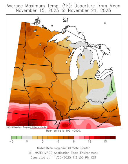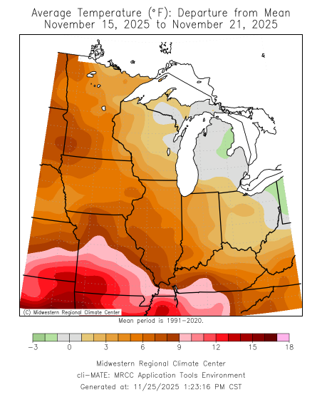 Minimum temperatures were most above normal across Missouri, western Kentucky, southwestern Minnesota, and northwestern Iowa, where they were over 10°F above normal for the week (Figure 2). The rest of the region was generally 5-10°F above normal. Minimum temperatures were slightly below normal across northeastern Wisconsin, Michigan, and the Greater Cleveland area. In Rockford, Illinois, the maximum temperature rose to 70°F on November 15, which was the latest 70°F+ temperature in Rockford during the calendar year since 2016.