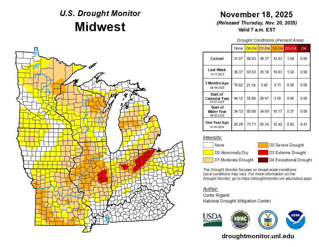 Drought increased across all categories from November 11 to November 18 (Figure 6). The largest increase was in the abnormally dry (D0) category, which increased from 63 percent to 68 percent of the region, most of which occurred over Minnesota and Wisconsin. Elsewhere, drought conditions mainly persisted, with a 4 percent increase in moderate drought (D1), mostly across Minnesota and Wisconsin.