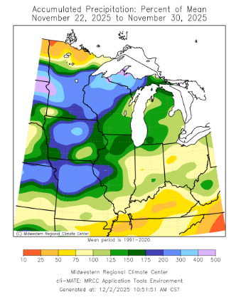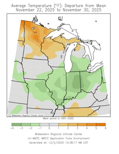 Average temperatures were slightly below normal for Illinois, Indiana, Missouri, Ohio, and southern Michigan (Figure 1). Average temperatures were up to 5°F above normal across northern Minnesota. Elsewhere, temperatures were near normal.