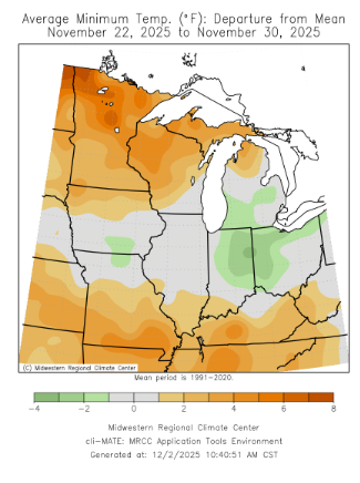 Minimum temperatures were generally 4-8°F above normal in a belt that stretched across most of the Upper Midwest, save southern Michigan (Figure 2). Another belt of above-normal minimum temperatures was observed over the far southern reaches of the region, stretching from the Kansas/Missouri border to the Kentucky Coalfields. Minimum temperatures were slightly below normal across eastern Indiana and western Ohio.
