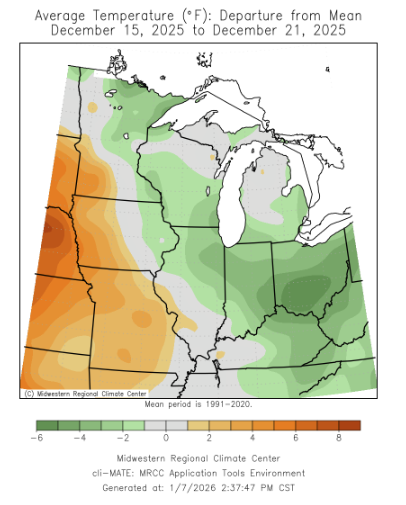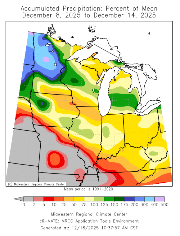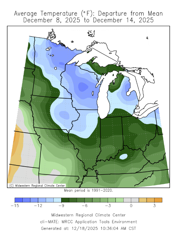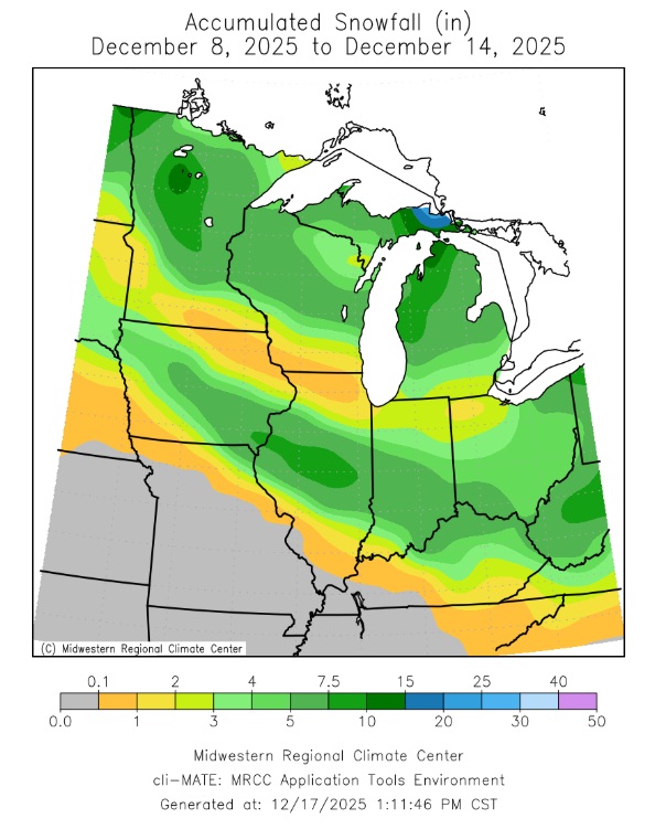 There were several snow events this week. Snow fell across the Upper Midwest snowbelt; however, two separate snow events took southerly tracks across Indiana, Illinois, Iowa, Ohio, and Kentucky. Totals for the week climbed over a half foot for portions of Iowa, Central Illinois, and Central Indiana (Figure 5). As of December 14, Indianapolis had received 11.2 inches of snowfall, making it the 2nd snowiest start to the month behind 1977.