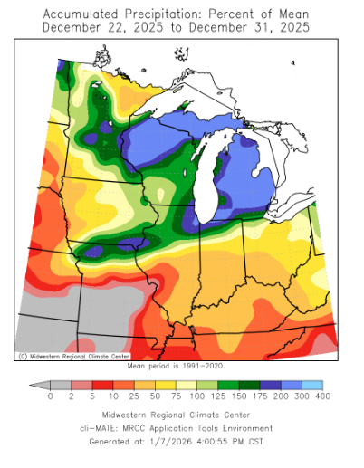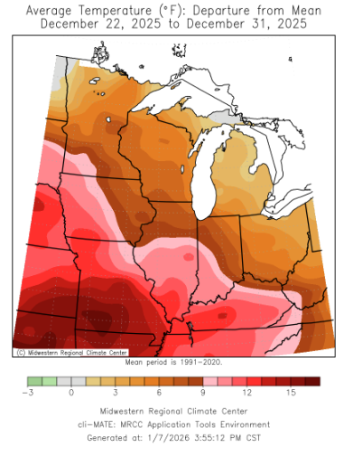 Average temperatures were significantly above normal for much of the region (Figure 1). In parts of southern Missouri, temperatures averaged over 15°F above normal for the final week of the year. Much of the region was at least 5-10°F above normal. Anomalies were less pronounced heading north, where temperatures averaged near to slightly above normal across the Canadian borderlands.