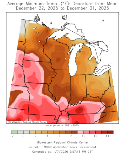 Minimum temperatures were most above normal across the south and west (Figure 2). Across western Iowa, Missouri, and Kentucky, minimum temperatures were 10-15°F above normal. Elsewhere, minimum temperatures were generally 5-10°F above normal.