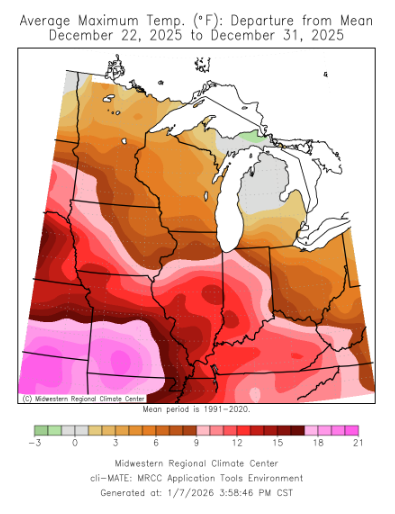 Maximum temperatures were over 20°F above normal across southern Missouri (Figure 3). Across western Iowa, northern and eastern Missouri, Illinois, Indiana, and Kentucky, maximum temperatures were 10-15°F above normal. Departures were less pronounced across the Upper Midwest, where they were near normal to up to 5°F above normal. Springfield, Missouri observed 6 days of temperatures above 70°F, a record for the longest stretch of consecutive 70°F+ days in December in Springfield since records began in 1888. It was also the second most 70°F+ days in Springfield in December, with six total days, tying December of 2021 and just behind the eight 70°F days in December of 1889.