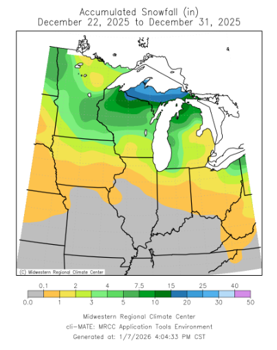 Precipitation was abundant across the Upper Midwest, where northern Wisconsin and Michigan observed 200-300 percent of normal precipitation (Figure 4). This contrasts with southern Missouri, where no precipitation was observed. Many places in the Ohio River Basin observed roughly 50 percent of normal precipitation. Some of the precipitation was wintry, though the heaviest totals were across the Upper Midwest (Figure 5). A strong low-pressure system that came through December 28-30 brought up to two feet of snow to Michigan’s Upper Peninsula (UP). The same storm system brought wind gusts near 60 mph around Lake Erie, which pushed the water so far eastward that the western edge of the lakebed along Michigan’s coast was exposed, revealing remnants of old piers from the 1800s.