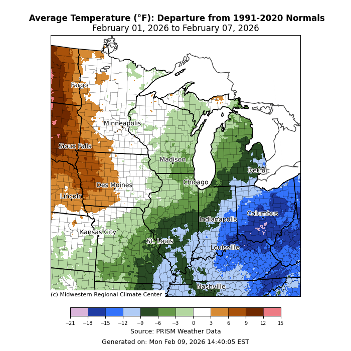 Minimum temperatures averaged as much as 20-24°F below normal across Ohio (Figure 2). Eastern Michigan, Indiana, southern Illinois, southeastern Missouri, and Kentucky were at least 8-12°F below normal for the week. Minimum temperatures were near normal across much of Minnesota and Iowa, though some parts of western Iowa were 4-8°F above normal. Fort Wayne observed a minimum temperature of -9°F on February 1, the coldest February temperature in Fort Wayne since 2014. In Portsmouth, Ohio, a station observed two consecutive days of temperatures dropping to -2°F, February 5-6, marking the coldest consecutive minimum temperatures there since 2015.
