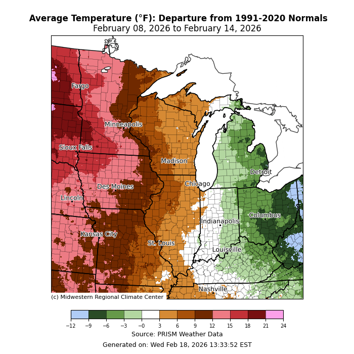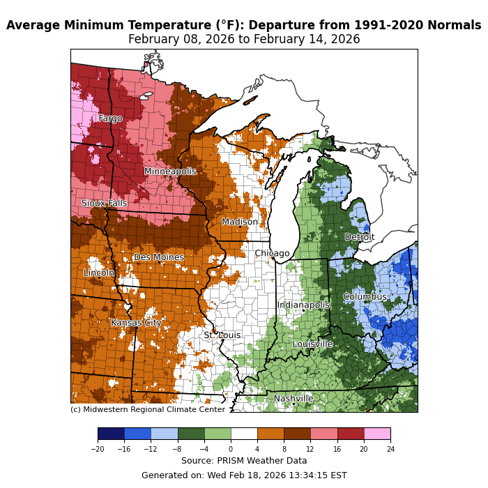 Maximum temperatures averaged above normal west of I-65 and below normal across eastern areas (Figure 3). Maximum temperatures were most above normal across Iowa, western Missouri, and western Minnesota, where temperatures averaged as much as 20°F above normal. In Sioux City, Iowa, a temperature of 75°F was observed, tying the record for the 2nd warmest February day on record since 1889.