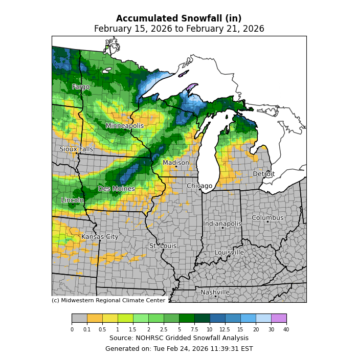 Precipitation was most abundant across the Upper Midwest, where some locations were as much as over 500 percent of normal (Figure 4). Another belt of above-normal precipitation occurred along I-70 from St. Louis, Missouri, to Columbus, Ohio. Precipitation was less than 50 percent of normal across northern Illinois, southeastern Iowa, and Ohio’s lakeshore. Precipitation largely fell as snow across the north, where parts of Michigan’s Upper Peninsula received nearly two feet of snow (Figure 5).