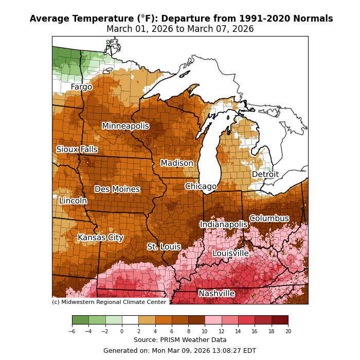 Temperatures were above normal for almost the entire region, save a small corner of northwestern Minnesota (Figure 1). Southernmost areas were as much as 14-16°F above normal for the week. Temperatures averaged 5-10°F above normal for much of the Midwest.