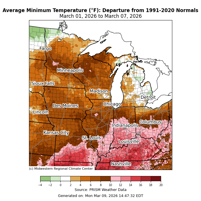 Minimum temperatures were above normal by 10-15°F across southern parts of the region (Figure 2). Much of the rest of the region was 5-10°F above normal for the week. In eastern Michigan and northwestern Minnesota, minimum temperatures were near normal.