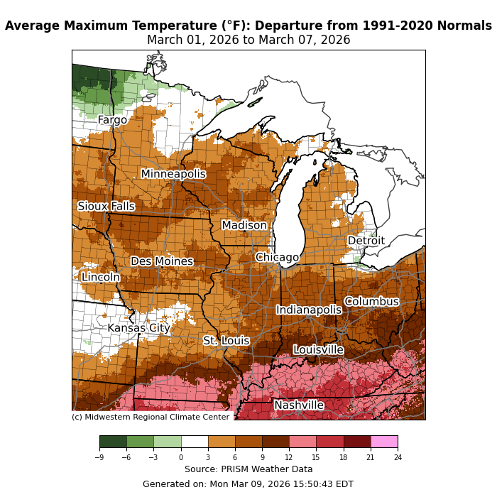 Maximum temperatures were above normal by 10-15°F in much of Kentucky, southern Illinois, southern Indiana, and southern Missouri (Figure 3). Across the region’s midsection, maximum temperatures were mainly 5-10°F above normal. In South Bend, Indiana, the temperature rose to 76°F on March 6, the earliest date on which a maximum temperature exceeded 75°F in the calendar year since 2000. In West Lafayette, Indiana, the maximum temperature rose to 81°F on March 6, which was the earliest temperature above 80°F in the calendar year since records began at that station in 1944.