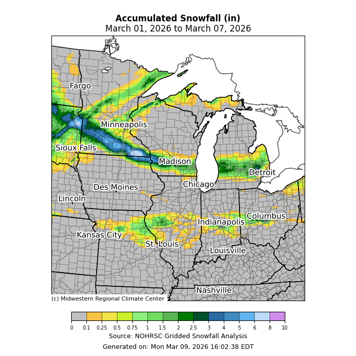 Precipitation was abundant this week with over 500 percent of normal precipitation along I-70 from Missouri to Ohio (Figure 4). Much of the region observed at least 200 percent of normal precipitation. Only across parts of Kentucky and the far northern tier of the region was precipitation below normal for the period. Much of the precipitation was in the form of rain, though some light to moderate snow accumulations occurred across the Upper Midwest and just north of I-70 (Figure 5).