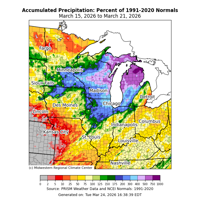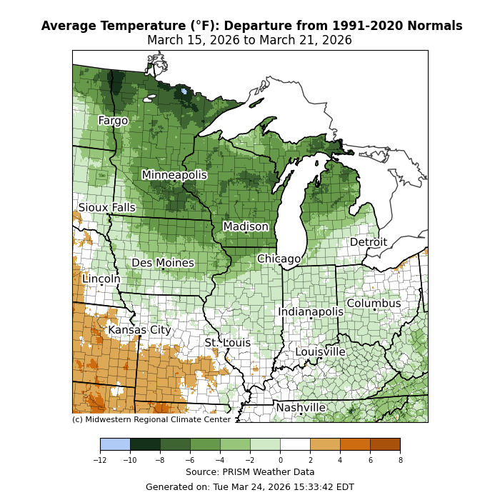 Temperatures were varied across the region. Average temperatures were above normal across southwestern Missouri by 2-4°F for the week (Figure 1). Across the Upper Midwest, average temperatures for the week were as much as 6-8°F below normal. The region’s midsection from Illinois eastward into Ohio was near to slightly below normal for the week.