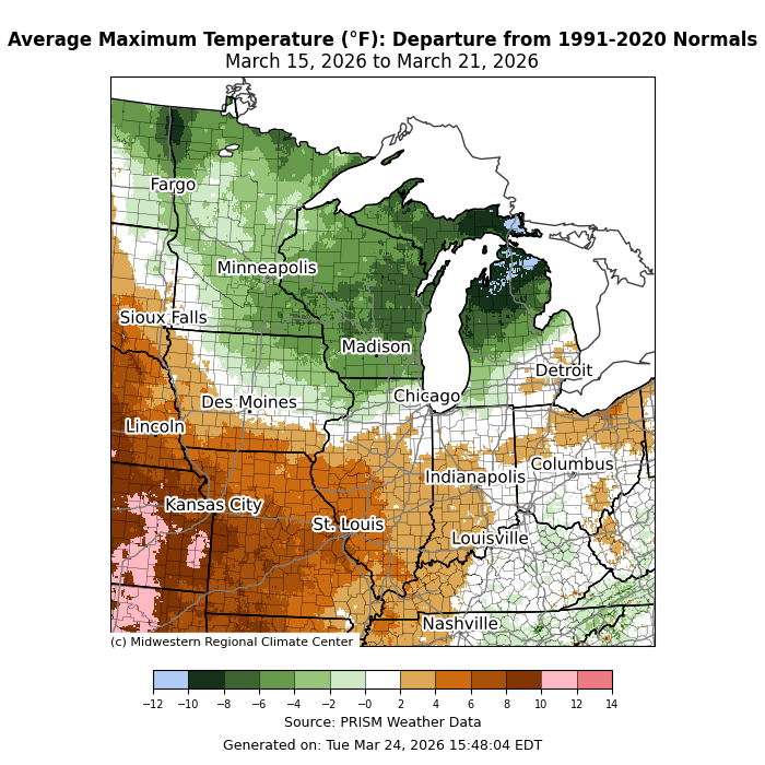 Maximum temperatures were above normal for many locations south of I-80 (Figure 3). More specifically, maximum temperatures averaged up to 10°F above normal for the week across parts of western Missouri. North of I-80, maximum temperatures were below normal by 3-6°F, though parts of northern Michigan were up to 10°F below normal.