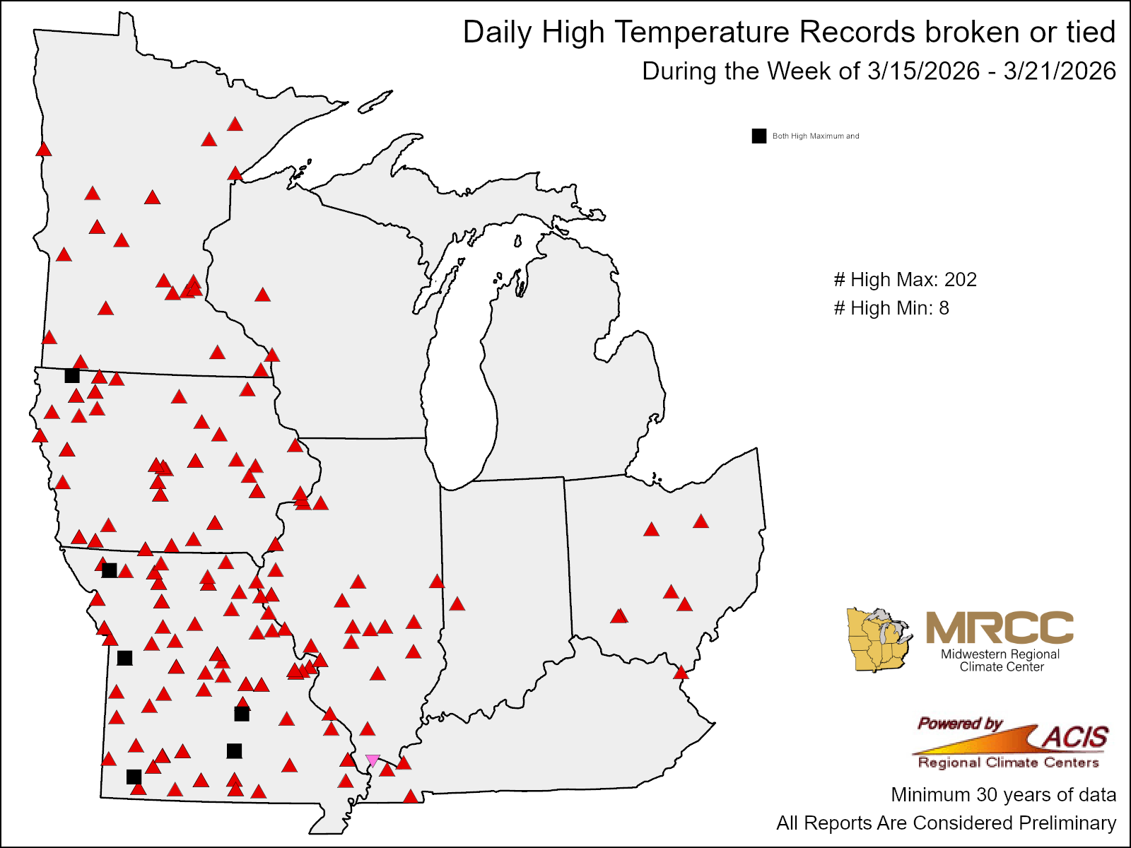 A warm front lifting across the Midwest on March 21 resulted in some of the warmest March temperatures on record. There were over 200 record high maximum temperature records set across the Midwest this week (Figure 4). Much of the region saw temperatures in the 70s, already pushing 20-30°F above normal at many observing locations. However, the most anomalous heat was west of the Mississippi River, where temperatures rose well into the 90s. Sioux City, Iowa, recorded a temperature of 95°F, which was 45°F above normal and the warmest temperature recorded in March in Sioux City since records began in 1889. In Kansas City, Missouri, the temperature rose to 93°F, which was 35°F above normal and the warmest temperature ever observed in March in Kansas City since records began in 1888. In Des Moines, Iowa, a maximum temperature of 91°F tied the previous all-time maximum temperature record for March. In Cedar Rapids, Iowa, a temperature of 89°F was 40°F above normal and the warmest temperature recorded in March since records began there in 1893.