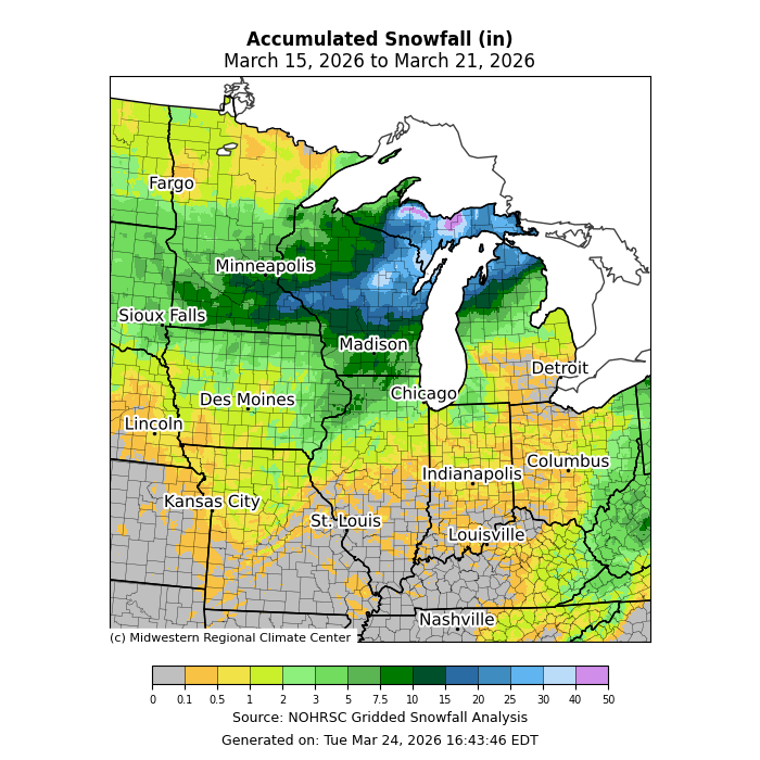Precipitation was most heavily concentrated across the Upper Midwest, particularly Wisconsin and Michigan, where it was over 500 percent of normal in spots (Figure 5). Across western Missouri, precipitation was near zero to 10 percent of normal. The area from Missouri eastward into Ohio received nearly 50 percent of normal precipitation. Across the Upper Midwest, precipitation largely fell as snow, with up to 40 inches of snow in snowbelt locations along Michigan’s Upper Peninsula (Figure 6). In Marquette, Michigan, 21.7 inches of snow fell, making it the second-largest single-day snowfall in March since records began in 1961.