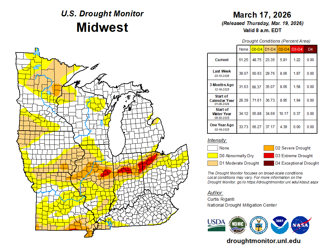 Drought conditions diminished across the region from March 10 to March 17 (Figure 7). D0 conditions (abnormally dry) now cover less than half the region, down from over 60 percent just one week prior. D1 (moderate drought) decreased by over 6 percent, mostly over Illinois and Missouri, while D2 (severe drought) decreased by over 2 percent across central Illinois.