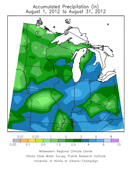 The month of August finally brought near normal to slightly above normal precipitation to some of the areas in the Midwest that were significantly deprived of precipitation in June and July. A band of precipitation measuring at least 3" stretched from southwest Missouri to eastern Michigan and northern Ohio, with some areas within this band receiving up to 6" throughout the month (Figure 1). Despite the 3" to 5" in some portions of Missouri, the north-central part of the state received much less, only 0.5" to 1.5" throughout the month. Other areas with less precipitation include Minnesota, northern Wisconsin, Upper Michigan, southeast Missouri, northern Kentucky, and parts of southern Ohio.