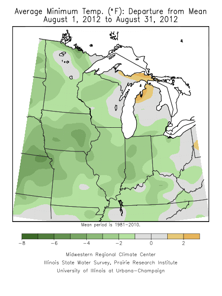 For many locations across the Midwest, August broke a string of warmer than normal months that have been trending since last fall. Overall, average temperatures were close to normal across a majority of the region (Figure 3). Some smaller portions of the region experienced temperatures that were 1°F to 2°F below normal, while small portions of the northern Midwest experienced temperatures that were 1°F to 2°F above normal.