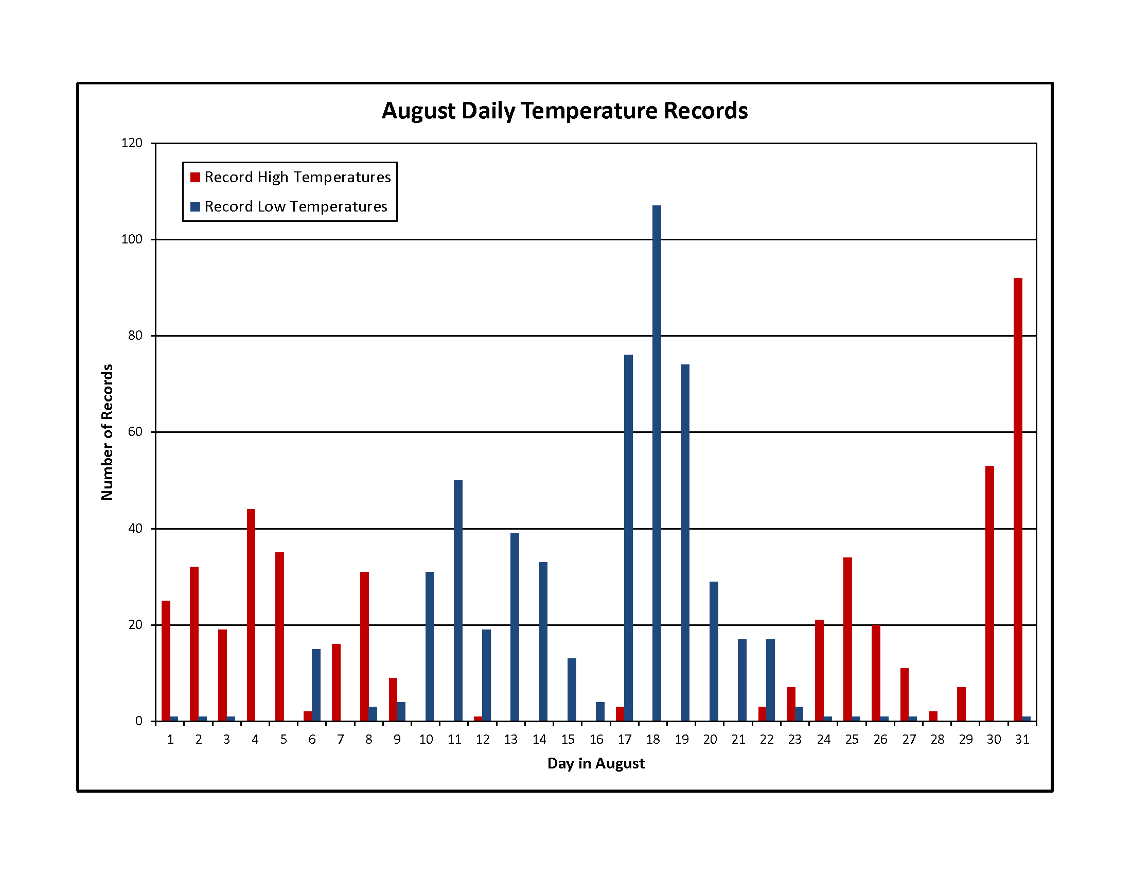 (Figure 5). Overall, there were just over 1,000 daily temperature records set throughout August (Figure 6) and a handful of monthly temperature records.