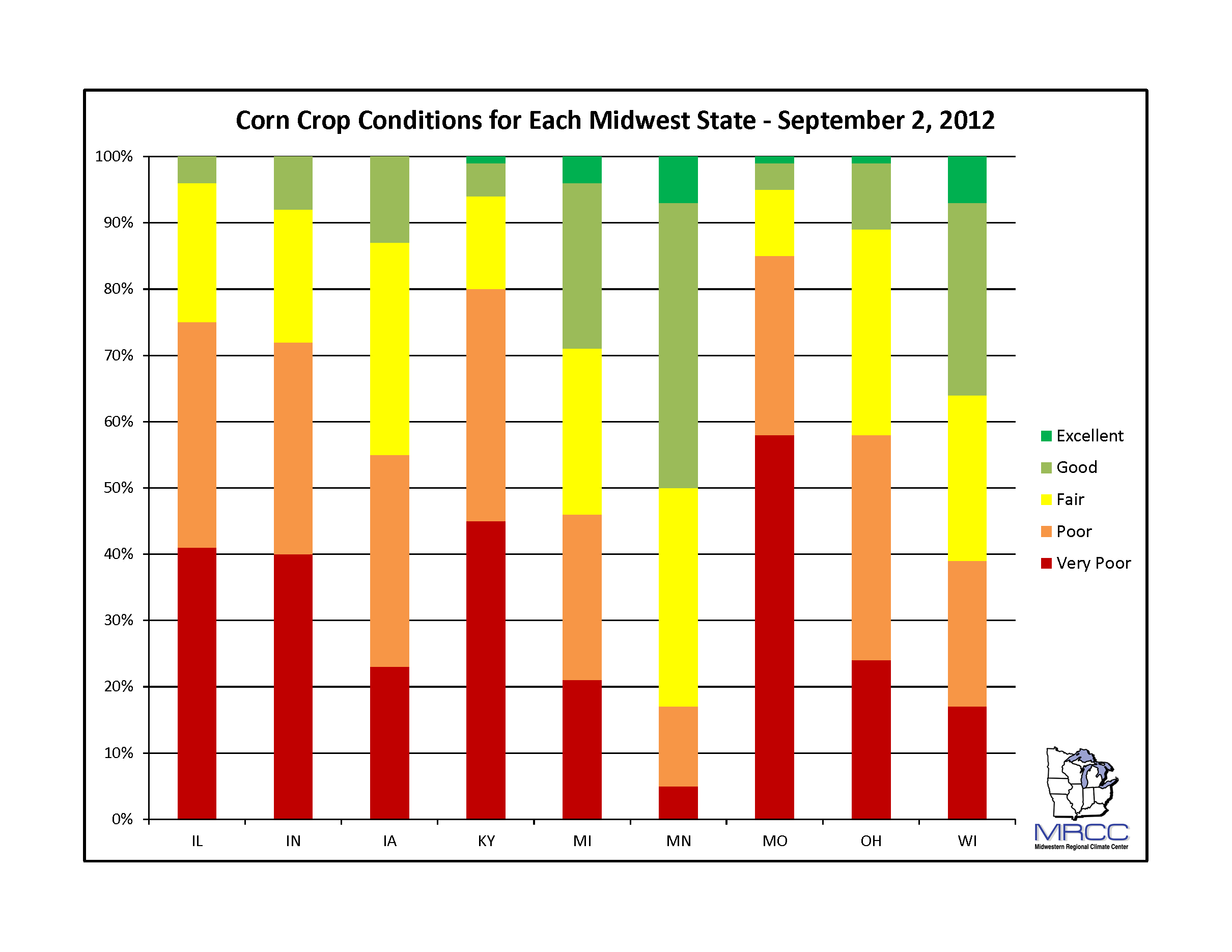Unfortunately, much of the rain that the region received in August came too late to save the drought-stressed crops in the region. Overall, the corn condition as of September 2nd remains poor throughout a majority of the Midwest states (Figure 8). Missouri and Kentucky reported the largest portion of poor or very poor corn, while a majority of the corn in Minnesota remains in fair or better condition.