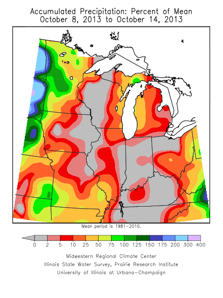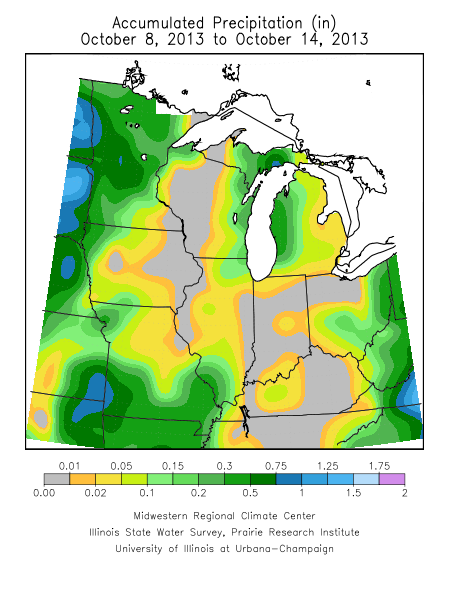 A majority of the Midwest experienced below normal precipitation during the second week of October (Figure 1), with much of the region not receiving any measurable precipitation (Figure 2). Areas with no precipitation included portions of all nine states, with the largest areas along the Mississippi River in Illinois and Iowa, in Wisconsin, Indiana, and Kentucky. Most of the precipitation during the week fell in Minnesota, southern Missouri, western Michigan, and eastern Ohio. The highest weekly totals were 0.75" to 1" and fell in southwest Missouri and northwest Minnesota. However, with the exception of northwest Minnesota, the areas that did receive precipitation were still below the normal accumulation for the second week of October.