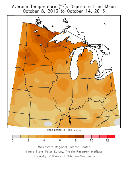 (Figure 3). Minnesota, northern Wisconsin, and Upper Michigan had the highest departures of 7°F to 10°F above normal. Temperatures were closer to normal further south in the region, with temperatures within a degree of normal in southern Missouri, southern Illinois, portions of Kentucky, and southern Ohio.