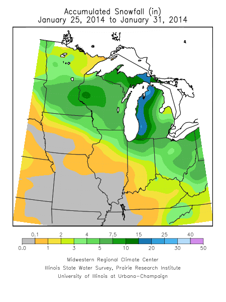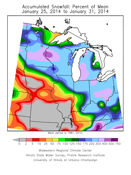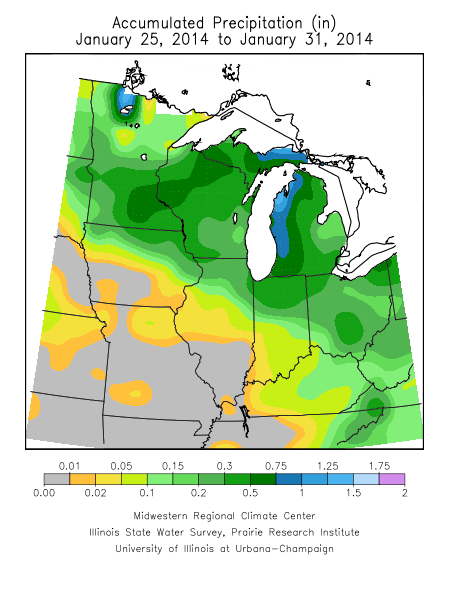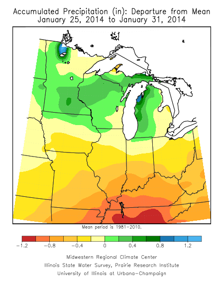 The pattern that kept precipitation in the northern and eastern portions of the Midwest region during the third week of January continued through the end of the month. Precipitation was sparse south of the line from northwest Iowa through central Kentucky (Figure 1). The only areas that received an inch of precipitation or greater were northern Minnesota, western Michigan, and parts of the eastern Upper Peninsula of Michigan. Those areas, along with much of Wisconsin and souther Minnesota were the only areas to receive normal or above-normal precipitation (Figure 2).