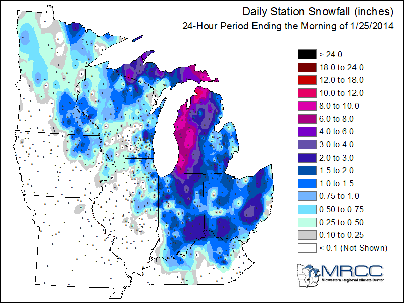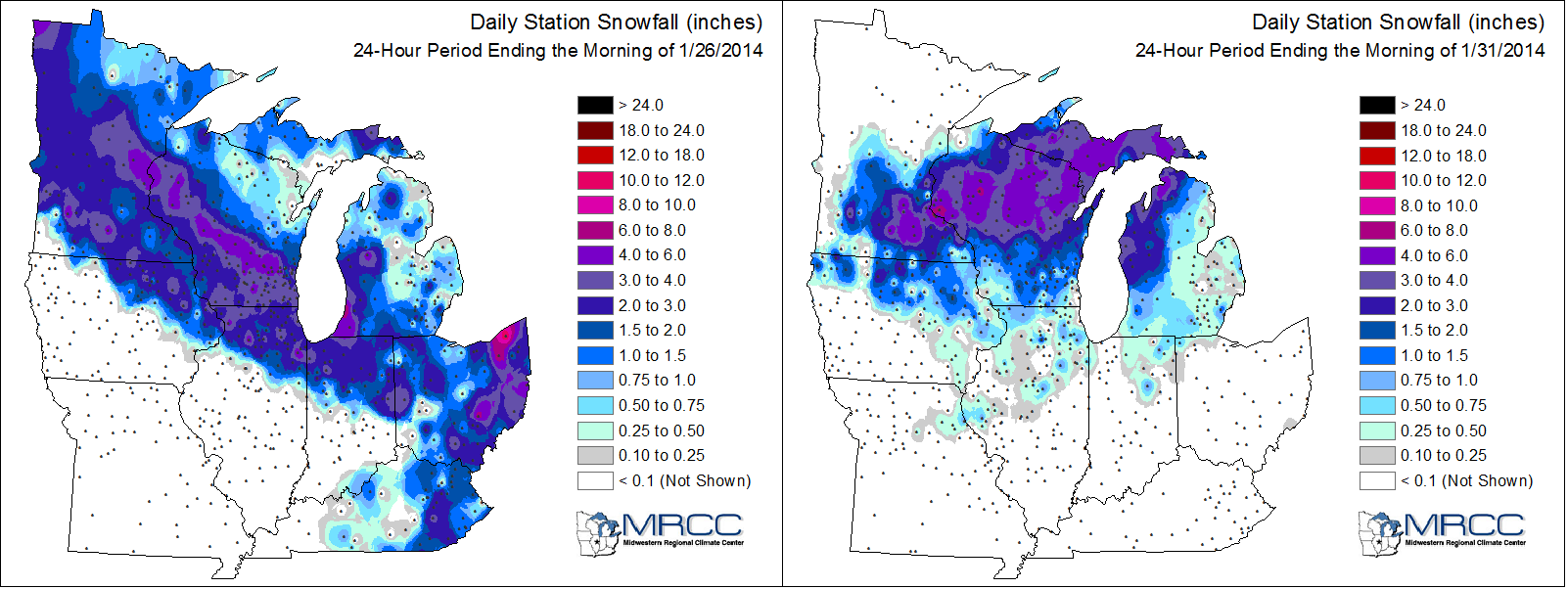 Since most of the precipitation was in the northern parts of the region, the majority of it fell as snow. Parts of western Michigan along Lake Michigan received as much as 25" of snow on the week (Figure 3). Even though as much as 25" of snow fell in parts of Michigan, the greatest positive departures from normal for snow were seen along the Minnesota-Wisconsin border where upwards of 10-15" of snow fell, 400-500% of normal (Figure 4). The majority of the non-lake effect snow fell on the 25th and 30th, primarily in Minnesota, Wisconsin, and the Upper Peninsula of Michigan (Figure 5). Throughout the week, lake effect snow fell along western Michigan, with the most pronounced totals occurring on the 24th through the morning of the 25th (Figure 6).