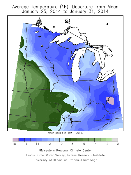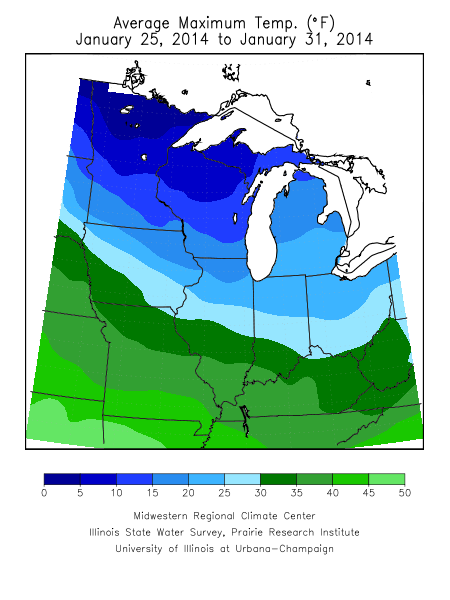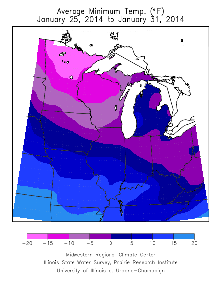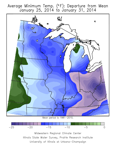 The last week of January saw the continuation of cold arctic air with another blast resulting in below average temperatures for the entire region (Figure 7). The largest departures from normal were seen in areas of northern Minnesota, northern Wisconsin, and southeast Ohio where temperatures were as much as 18°F below normal. Average maximum temperatures were in the single digits for much of Minnesota, Wisconsin and the Upper Peninsula of Michigan, with below freezing average highs as far south as northern Kentucky (Figure 8). Average minimum temperatures were in the single digits in most of the region, while areas of northern Minnesota and northern Wisconsin experienced average minimum temperatures in the -10°F to -20°F range (Figure 9). The minimum temperatures were the biggest driver of the below normal temperatures in the region as they were as much as 25°F below normal in parts of southeastern Ohio (Figure 10).