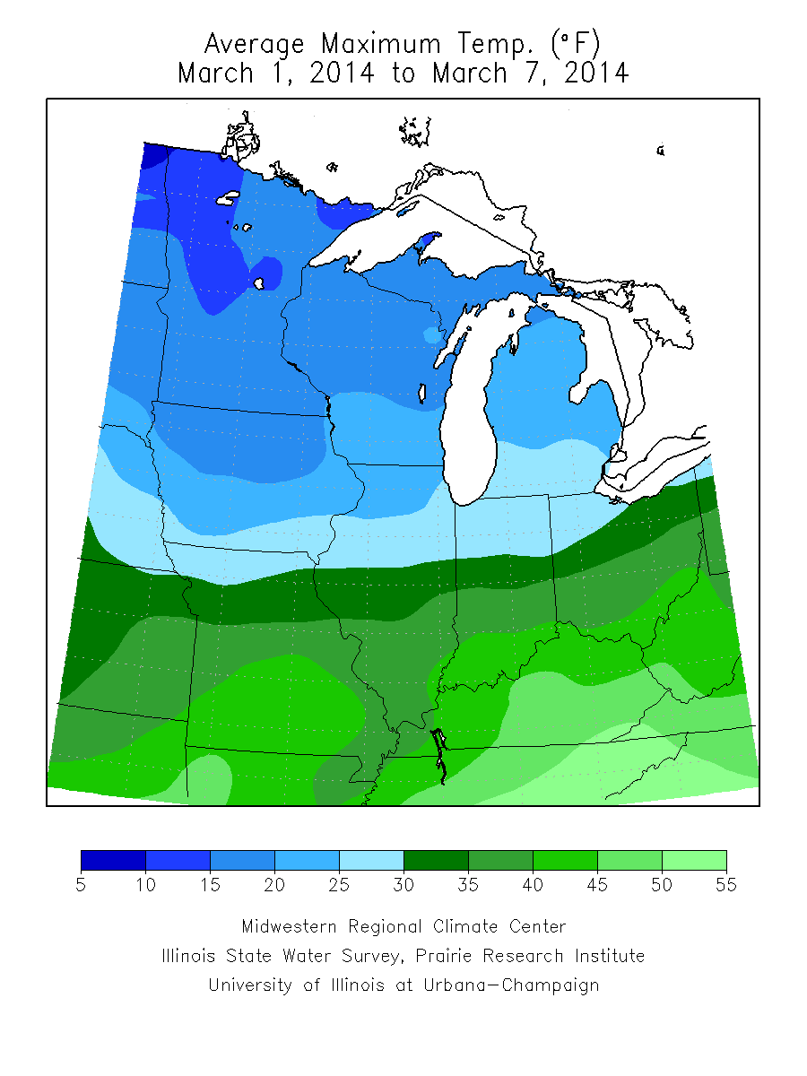 Temperatures were cold across the Midwest and much colder than normal for most. In the southeast, mostly in Kentucky, temperatures were 5°F to 10°F below normal while the rest of the region was 10°F to 20°F below normal (Figure 4). The coldest areas were in Iowa, Minnesota, Wisconsin, and Michigan. Maximum temperatures
