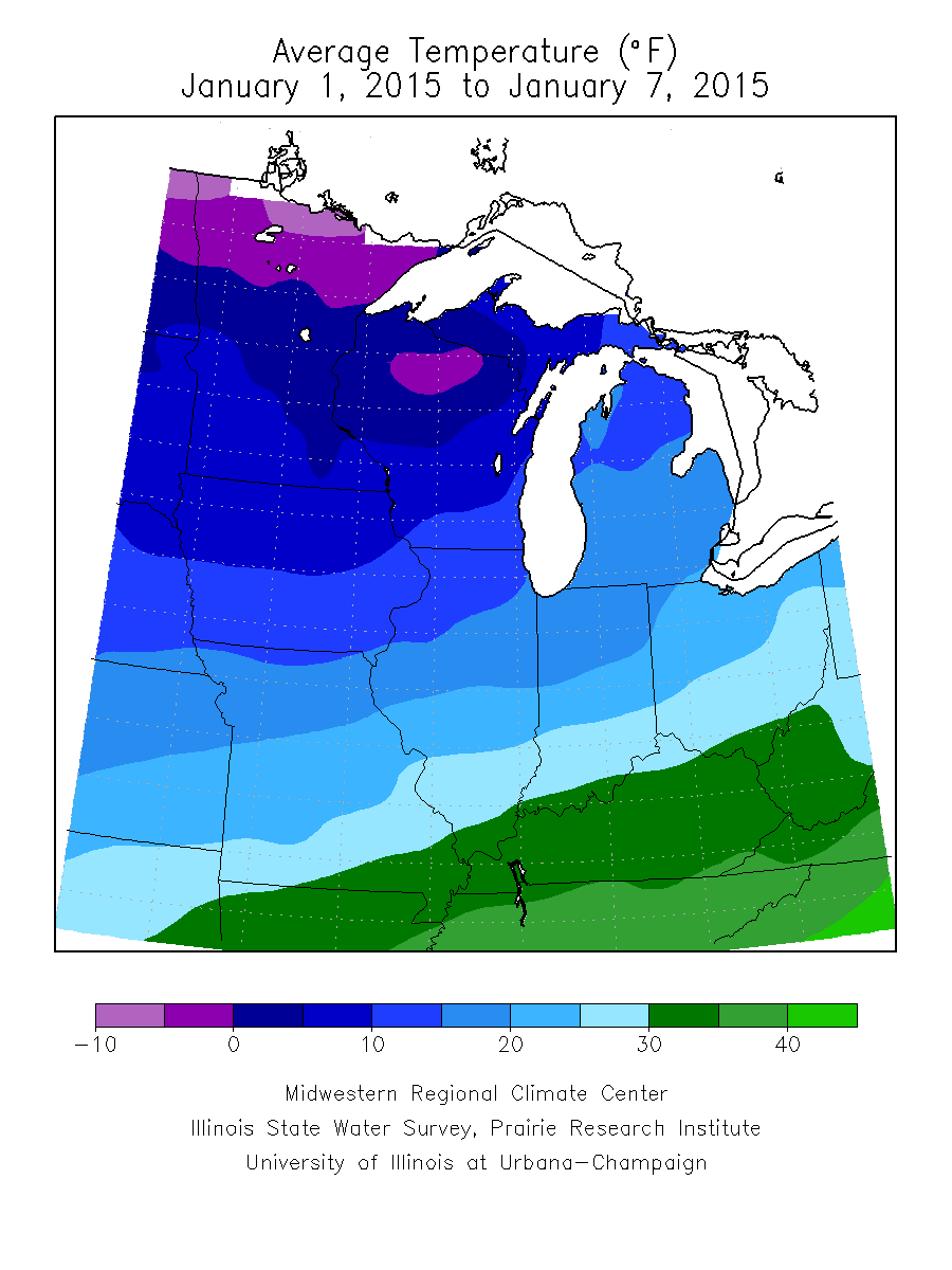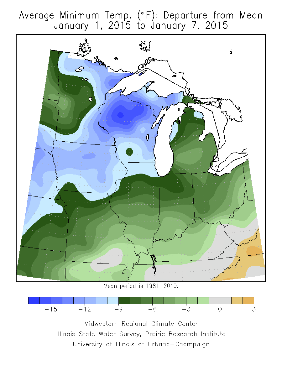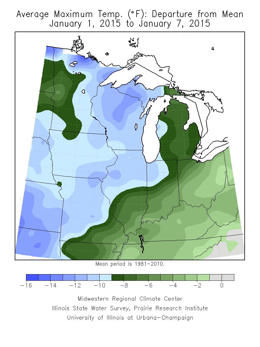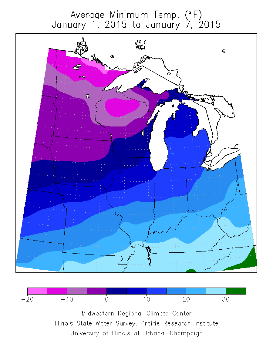 (Figure 1). The coldest pockets of air impacted northern Minnesota, Iowa, Wisconsin, and far northwest Michigan on the 5th and 6th of January with preliminary temperature records set for 24 hour lowest maximum and 24 hour lowest minimum temperatures across Minnesota, Wisconsin, and Michigan from a cold air outbreak event that swept over much of the region. Average maximum temperatures remained below 30°F in the northwest two-thirds of the region, with the northwest half of the region averaging 9 to 15°F below normal (Figure 2). Average minimum temperatures dropped to 20°F below freezing across northern Minnesota and north-central Wisconsin, gradually increasing to the south and east, but never climbing above 30°F degrees on average across the region (Figure 3). Cold average minimum temperatures across northeast Minnesota, Wisconsin, Iowa, and the upper peninsula of Michigan, averaged 9 to 17°F degrees below normal (Figure 4). Elsewhere, temperatures ranged from 0 to 9°F degrees below normal with warmest temperatures in Kentucky and decreasing to the northwest.