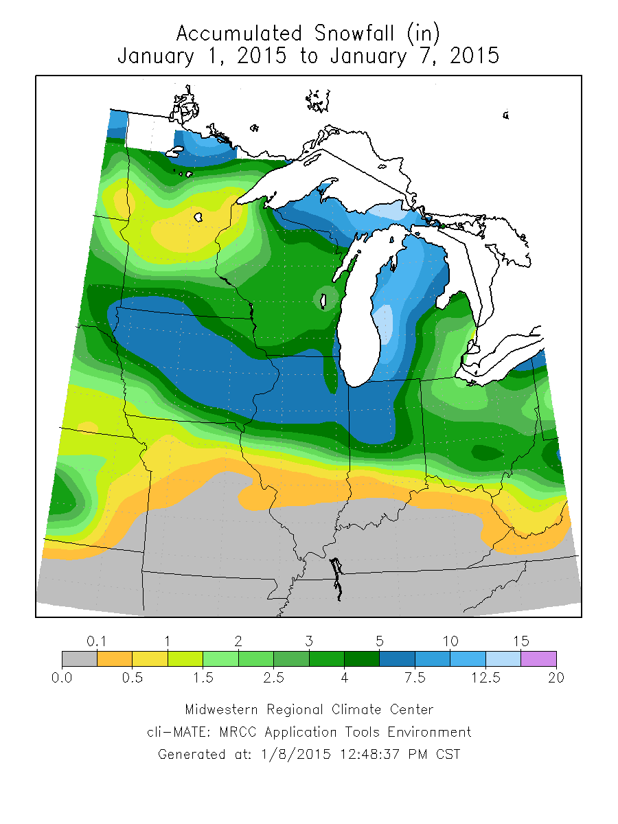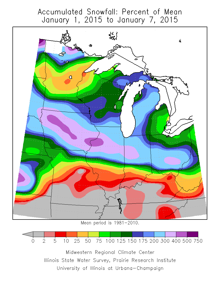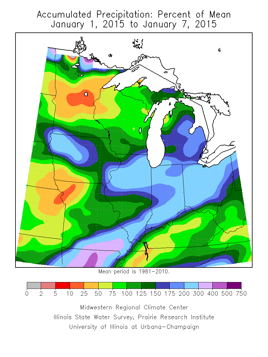 Accumulated precipitation amounts of 0.5” to 2.5” fell during the first week of January across Illinois, Michigan, Indiana, and Ohio. Southeast Missouri recorded over 3.0” of precipitation. Much of Minnesota, Southwest Iowa, and Northwest Missouri remained dry with less than 0.2” of precipitation recorded (10-25% of mean) (Figure 5). The remaining portion of the region observed 125-300% of mean accumulated precipitation with southeast Missouri experiencing accumulated precipitation values of 300-400% of mean (Figure 6). A weather system moving from the northwest to the southeast across Iowa, northern and central Illinois, northern and central Indiana, and central Ohio resulted in snowfall on the 5th and 6th of January with depths measuring 4” to 7.5” and setting new 24 hour snowfall records (preliminary). Lake effect snowfall 10.0” to 15.0” also fell in regions along the Great Lakes (Figure 7). The storm resulted in accumulated snowfall 200+ percent of mean for these locations. Much of Missouri, southern Illinois, southern Indiana, Kentucky, and Minnesota currently only have accumulated snowfall values up to 50 percent of mean as of January 7, 2015 (Figure 8).