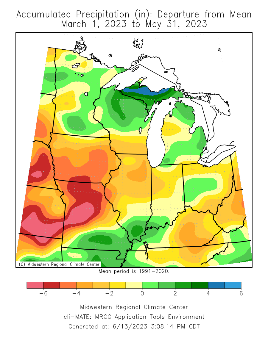 The average May temperature for the Midwest was 61.0°F, which was 1.3°F above the 1991-2020 normal (Figure 1). Average temperatures in the far eastern region were slightly below normal, while areas west of the Mississippi River were up to 9°F above normal (Figure 2). Maximum (Figure 3) and minimum (Figure 4) temperatures followed a similar west-to-east spatial pattern. Statewide average temperatures ranged from 1.7°F below normal in Ohio to 4.5°F above normal in Minnesota. Statewide, Minnesota recorded the 6th warmest May since 1895. No monthly average, maximum, or minimum temperature records were broken among long-running stations across the Midwest in May. Three stations in Minnesota ranked in the top ten warmest for May, including Minneapolis-St. Paul, which recorded the 6th warmest May in 151 years. The average spring (March-May) temperature for the Midwest was 0.1°F below normal (Figure 5), with most areas near to slightly above normal, except in Minnesota, where temperatures were up to 4°F below normal for spring (Figure 6).