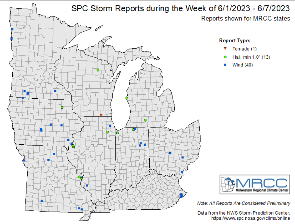 Accompanied with the hyper-localized precipitation, there were preliminary storm reports every day this week. There was 1 tornado, 12 hail, and 40 wind preliminary storm reports this week (Figure 10). There was a brief landspout reported on June 1 in Walworth, Wisconsin. A 64-mph gust occurred at the Kirksville Regional Airport on June 2. Henderson, IL reported crop damage as a result of hail on June 4.