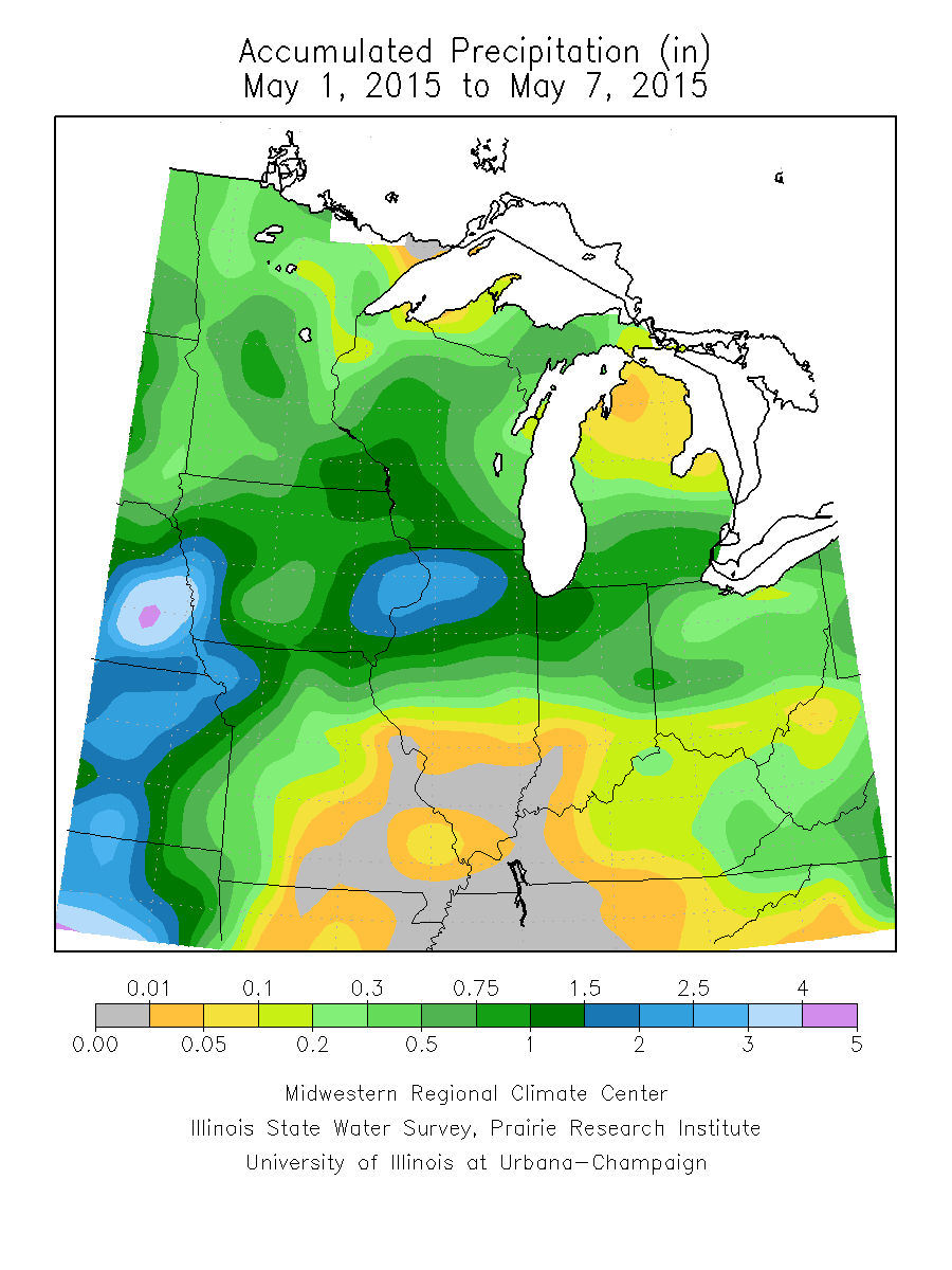 With drier (Figure 9) and warmer (Figure 10) weather prevailing over the calendar week from April 27-May 3, many farmers across the Midwest were able to get out to their fields and plant spring crops. Corn planting in Iowa, Illinois and Missouri neared 70% while Minnesota has over 80% planted according to the National Agricultural Statistics Service (Figure 11). This progress is well above the five year average for these states, with Minnesota nearly 50% above the five year average. Drier conditions this spring in allowed for earlier planting, making Minnesota’s crop progress to this point the second highest in the past 30 years.