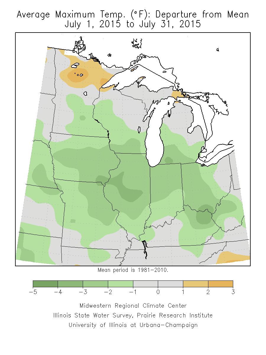 The average temperature for July across northeast Minnesota, Wisconsin, and Michigan was between 65 to 70°F (Figure 1). The rest of Minnesota heading southward towards the Ohio River warmed into the lower to mid-70’s, reaching an average temperature between 75 to 80°F upon entering Missouri, the southern half of Illinois, the southern two-thirds of Ohio, and much of Kentucky. These temperatures were for the most part seasonal, with average temperatures 1 to 3°F cooler than normal across the center portion of the Midwest region and temperatures across northern Minnesota and southern Missouri 1 to 3°F warmer than normal on average (Figure 2). The monthly average maximum temperature reduced monthly average temperature with cooler than average maximum high temperatures across a vast majority of the region (Figure 3). Only northern Minnesota really experienced maximum monthly temperatures greater than 1°F from normal. The average minimum temperature for July in the region was above normal in the northern and southern portions of the Midwest region, and seasonal to cooler across the central portion of the region (Figure 4). Illinois, Indiana, Iowa, Michigan, Ohio, and Wisconsin all experienced average temperatures cooler than normal by about 1°F. Only Kentucky, Michigan, and Minnesota witnessed warmer than normal monthly temperatures, though none by more than 0.6°F. This had the region rank as the 44th coolest July on record.