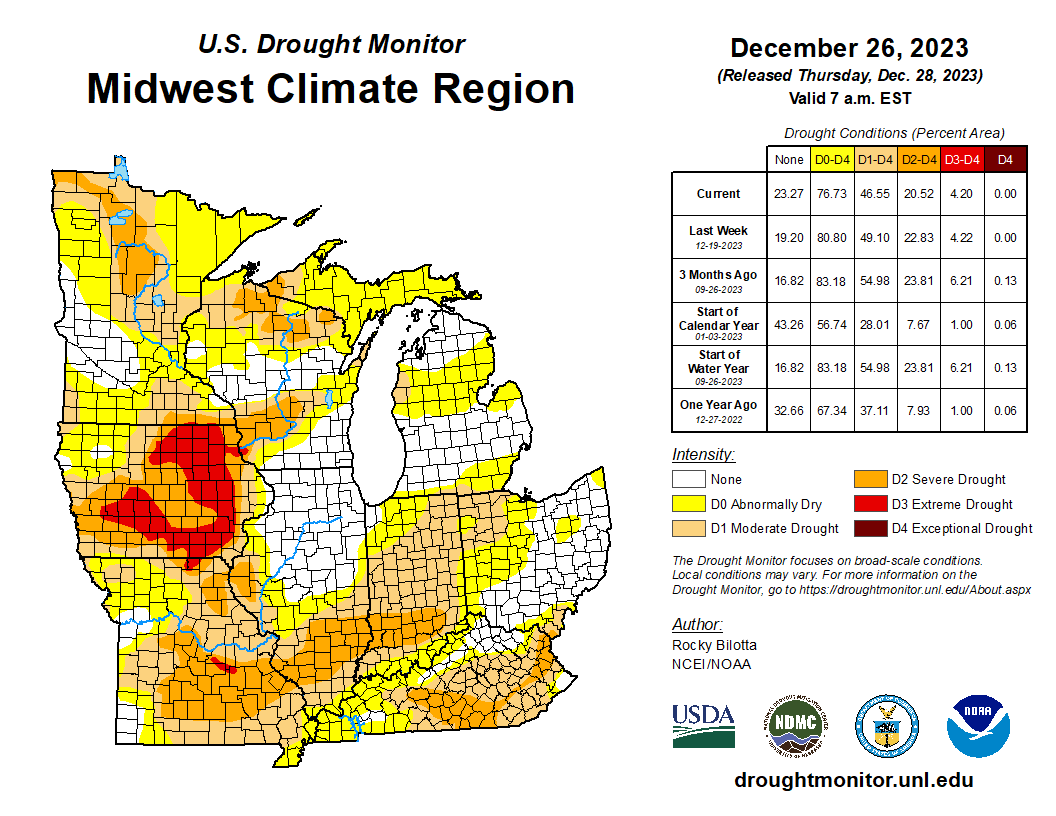 Drought persisted during December with some areas showing modest improvements and others having modest declines. Overall, the month ended with about 77 percent of the region abnormally dry or in drought, which was 1 percent more than at the start of the month (Figure 8). The most intense drought conditions remained parked over Iowa, with 35 percent of the state in extreme (D3) drought on the U.S. Drought Monitor map. Drought intensified in southwest Iowa and along a swath from southern Missouri to northwest Ohio. Conditions improved slightly in central Minnesota, far western Missouri, and the northern half of Illinois.