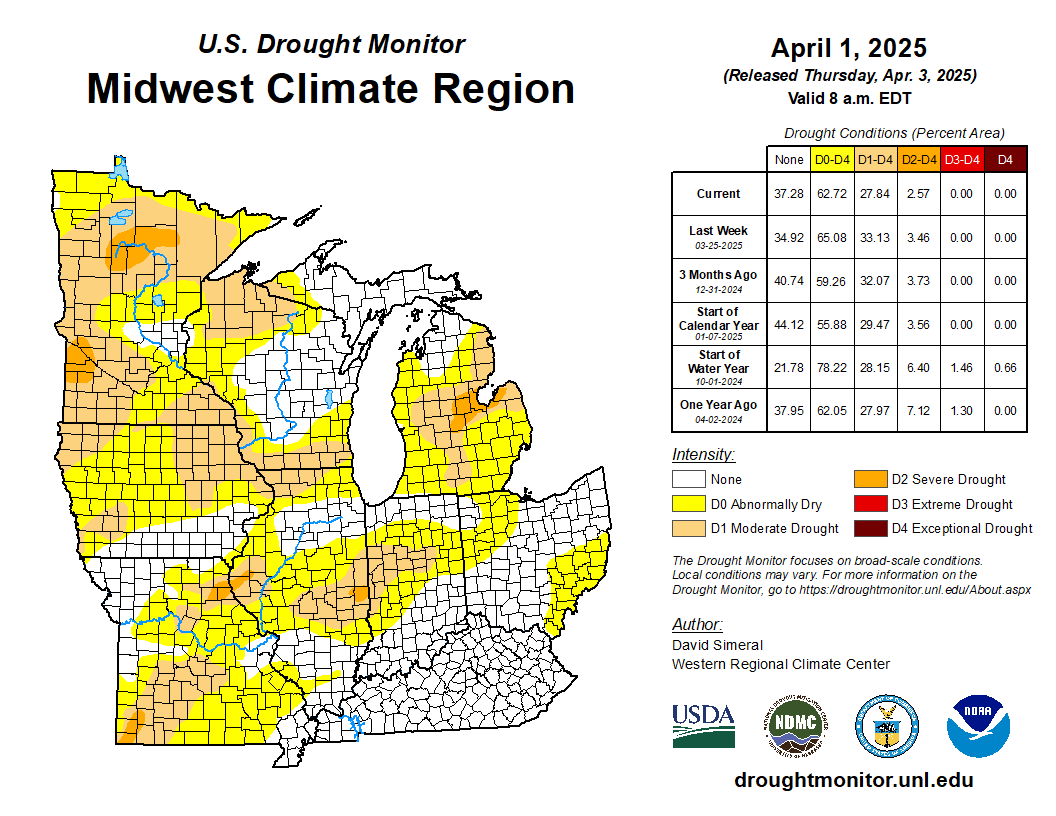 There were notable improvements in drought and abnormal dryness across the month. April started with about 62 percent of the region dry or in drought (Figure 9) and ended with about 31 percent affected (Figure 10). Kentucky, Missouri, Indiana, and Ohio were completely drought-free. The remaining five Midwestern states had just isolated pockets of drought.