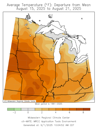 Average temperatures were above normal regionwide, save Michigan’s UP (Figure 1). West of the Mississippi River, temperatures averaged as much as 6-8°F above normal for the week. East of the Mississippi River, temperatures averaged 3-6°F above normal for the week.