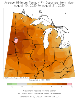 Minimum temperatures averaged even more above normal. Minimum temperatures were nearly 10°F above normal in parts of western Iowa and western Minnesota (Figure 2). East of the Mississippi River, minimum temperatures were 3-6°F above normal.