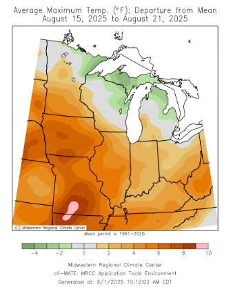 Maximum temperatures were slightly below normal by 1-3°F across Michigan’s UP, Minnesota’s Arrowhead region, and northern Wisconsin (Figure 3). They were near normal through the rest of Michigan and Wisconsin. The rest of the region saw above normal maximum temperatures, ranging from 2-4°F above normal in the Ohio Valley to nearly 10°F above normal across southern Missouri. In Springfield, Missouri, temperatures remained at or above 97°F for five consecutive days, which was the longest stretch of such heat in August since 2014.