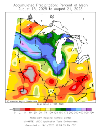 Southern Minnesota was the rainfall winner with over 400 percent of normal precipitation (Figure 4). Southern Wisconsin, Chicagoland, Northwest Indiana, and Michigan’s UP all observed over 200 percent of normal precipitation. Precipitation was sparse outside the aforementioned locations, with little to no precipitation observed for the week across Kentucky, Missouri, and southern Ohio.