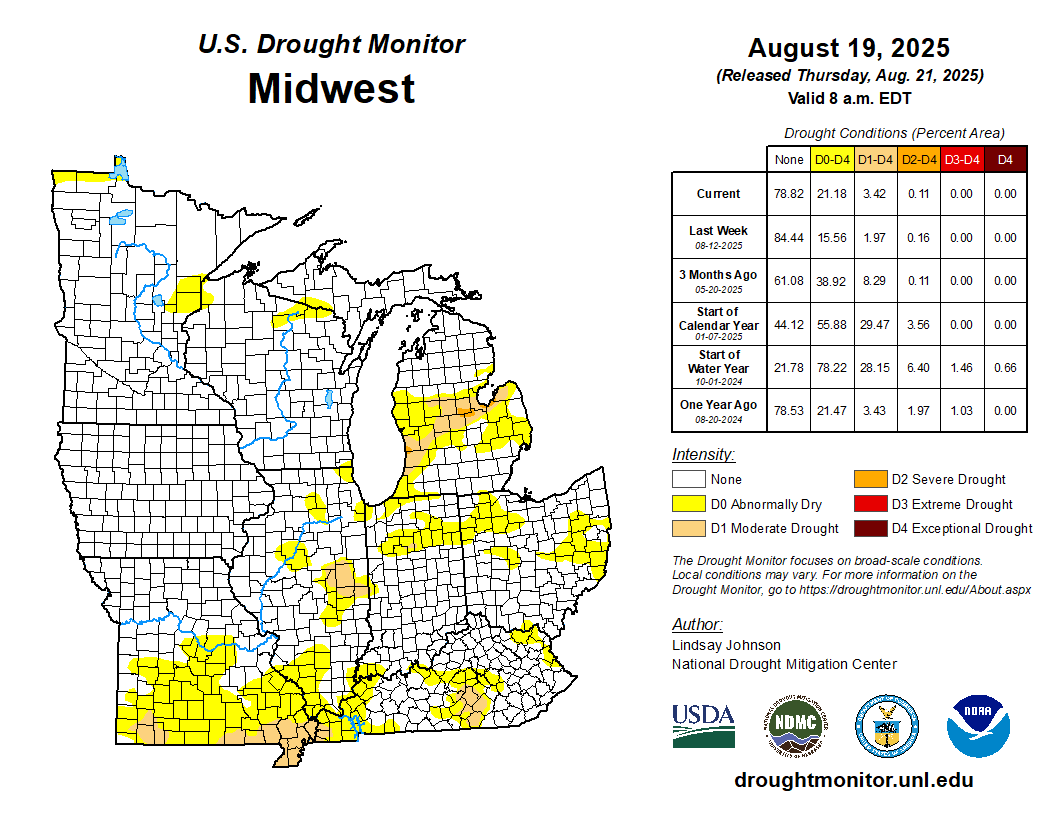 With drier conditions across the southern reaches of the region, D1 (moderate drought) expanded across the Missouri Bootheel and Central Kentucky. This was the opposite of the Upper Midwest, where slight improvements in D1 were made across Mid-Michigan (Figure 5).