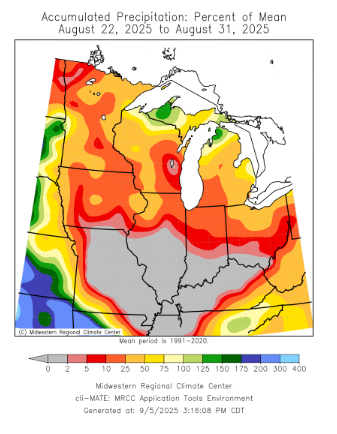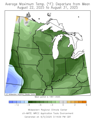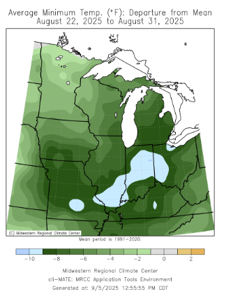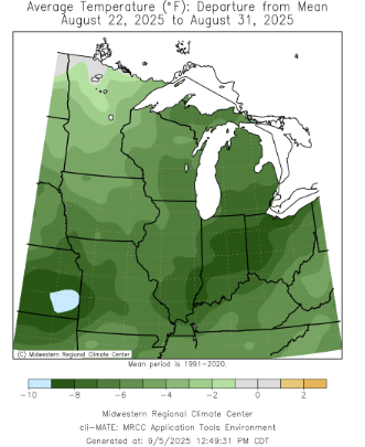 The final week of August was significantly cooler than the prior week(s). The entire Midwest observed below normal temperatures. Average temperatures were a widespread 5-10°F below normal (Figure 1). Across Minnesota, they were slightly less anomalous, albeit still 3-5°F below normal.